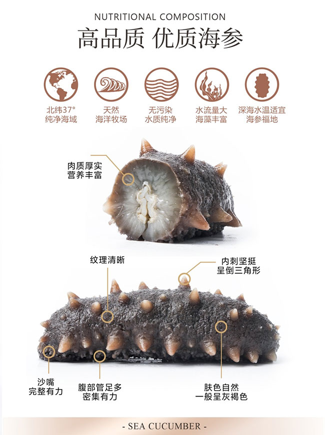 海參屬于無脊椎動物、棘皮動物門、海參綱。我國海參分布在溫帶區(qū)和熱帶區(qū),溫帶區(qū)主要在黃渤海域,主要經(jīng)濟品種是刺參,也是我國最為知名的海參種類,熱帶區(qū)主要在兩廣和海南沿海,主要經(jīng)濟品種有梅花參等。其中西沙群島、南沙群島和海南島是我國熱帶海參的主要產(chǎn)地。海參在各類山珍海味中位尊“八珍”,還具多種中醫(yī)特指的補益養(yǎng)生功能。近半個世紀以來,國內外學者對40多種海參化學成分的研究表明海參體內不但富含氨基酸、維生素和化學元素等人體所需的50多種營養(yǎng)成分,還含有多種生物活性物質如酸性粘多糖、皂苷和膠原蛋白等,而且海參活性物質的藥理活性十分廣泛。